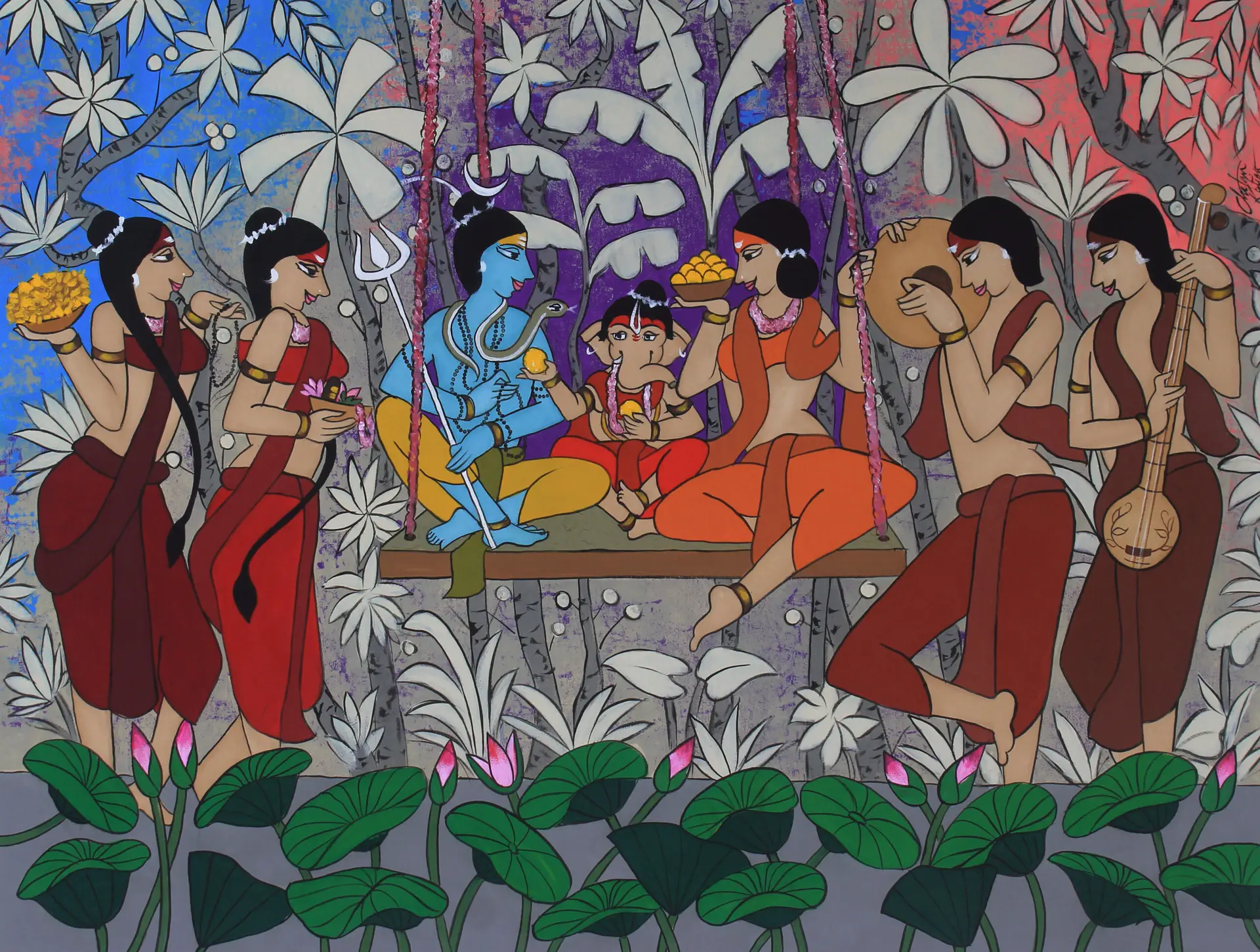 "Divine Family" depicts the divine trio of Shiva, Parvathi, and Ganesha, surrounded by blooming flowers and the serene moon. With Nandi, their loyal vehicle, and the Trishul symbolizing power, the family exudes love and happiness amidst a forest setting. This original acrylic painting on canvas celebrates the unity and blessings of the sacred family.